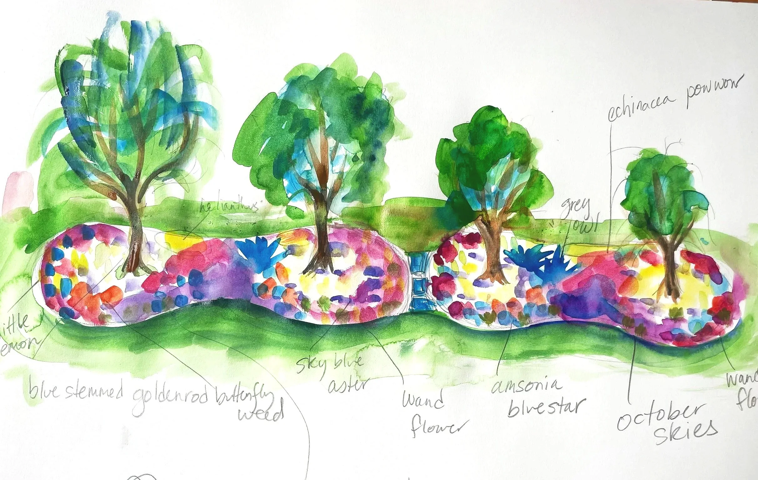 Not sure where to begin? We will come to your yard for a consultation and site analysis. Based on your goals we can create a custom design unique to your preferences, needs, and microclimate. We will help identify the best native plants suited to your area, offer you a hand-drawn design and watercolored elevation, and make a planting plan.
